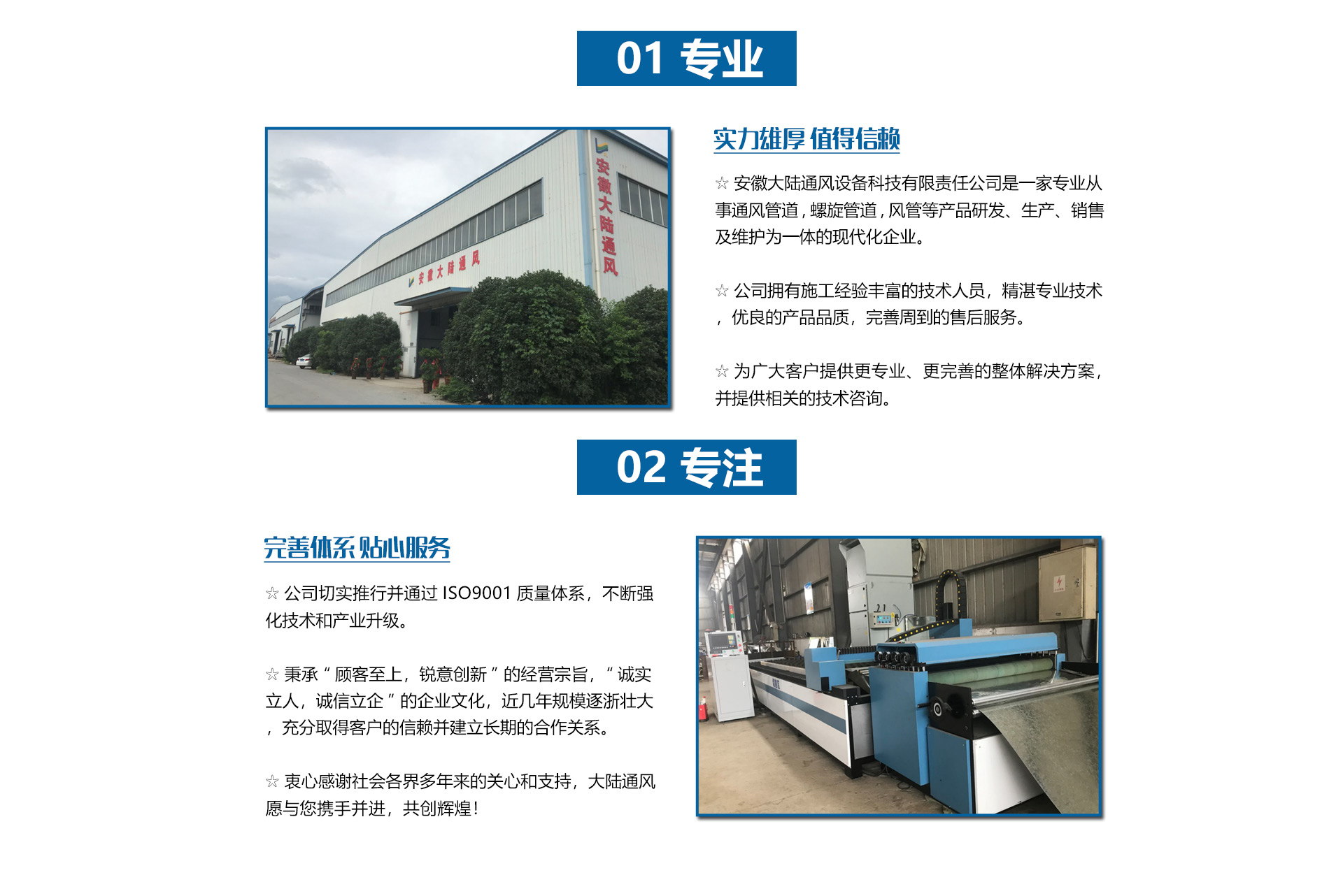 安徽大陸通風設備科技有限責任公司加工共板法蘭風管、螺旋風管、角鐵法蘭風管、插接式風管。價格合理。質(zhì)量保障。是國內(nèi)生產(chǎn)和研究通風管道的企業(yè),工廠坐落于經(jīng)濟發(fā)達的安徽省合肥市。公司配備了好的自動化流水線設備和先進的制作安裝技術。
